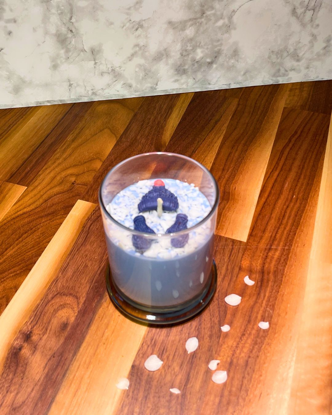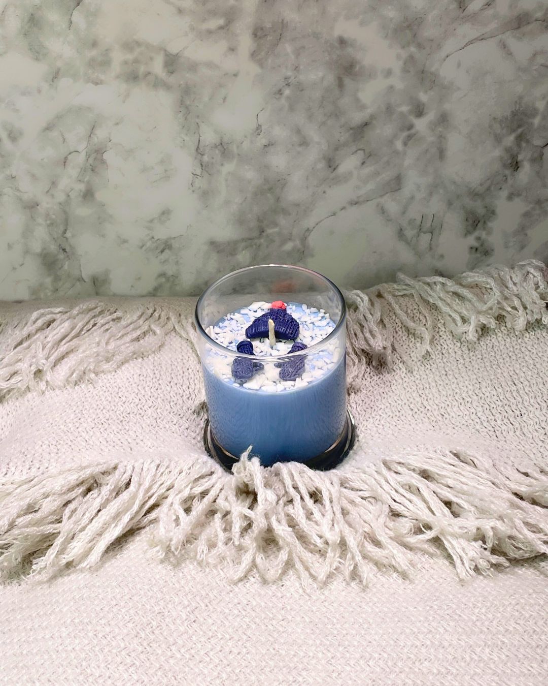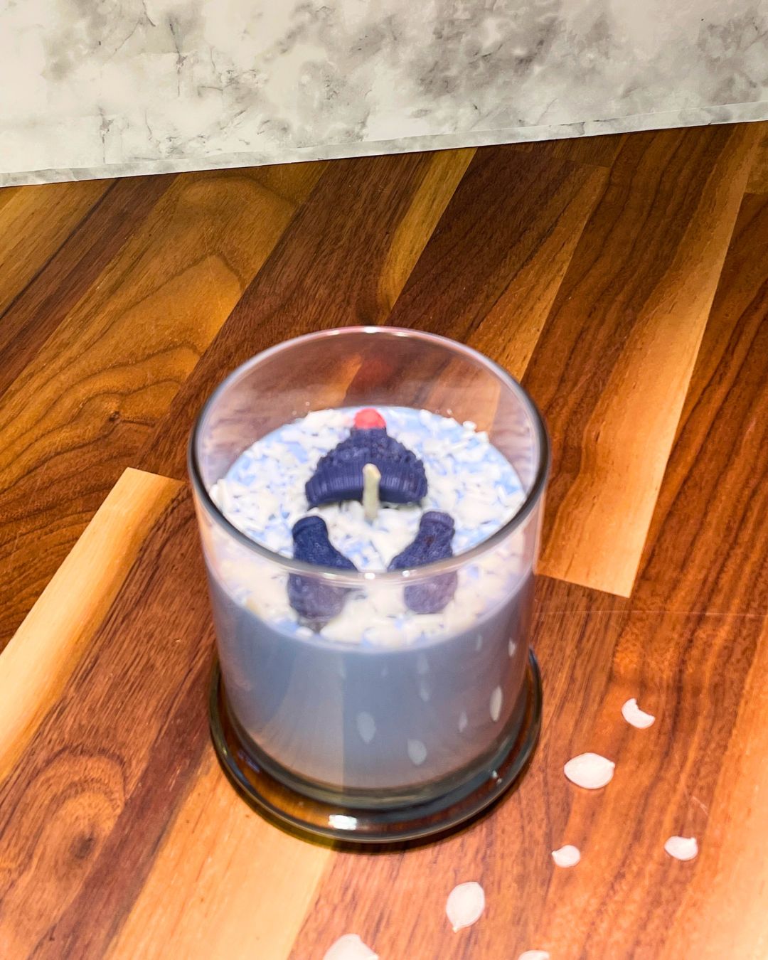 Topped with a pillar wax hat and mitten embed and flaky white wax "snow" because if you're going to throw snowballs, you need the gear.